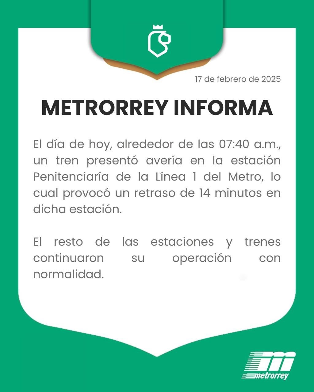 Momentos después del incidente, Metrorrey publicó un comunicado en el que informó que a las 7:40 a.m., un tren presentó una avería en la Estación Penitenciaría, lo que generó un retraso de aproximadamente 14 minutos. Según la información oficial, el resto de las estaciones continuaron con su operación normal.